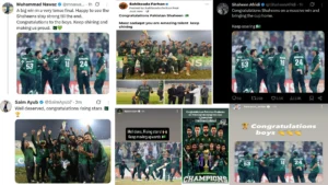 بابر اعظم، شاہین آفریدی، نسیم شاہ، سلمان مرزا، محمد نواز اور عثمان خان نے پاکستان شاہینز کو ایشیا کپ رائزنگ اسٹارز جیتنے پر مبارک باد دی۔