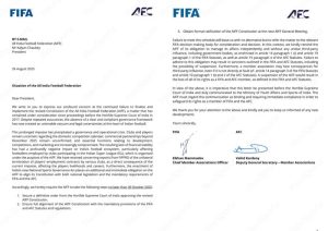 خط میں کہا گیا ہے کہ فیفا اور اے ایف سی کا آئین اس حوالے سے واضح ہے، اے آئی ایف ایف بھارتی سپریم کورٹ سے اپنے نظرثانی شدہ آئین کا آرڈر کروائے۔