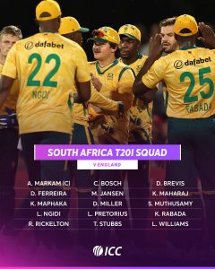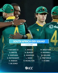 جنوبی افریقہ نے انگلینڈ کے خلاف سیریز کے لیے ون ڈے اور ٹی ٹوئنٹی اسکواڈ کا اعلان کر دیا ہے۔ یہ سیریز 2 ستمبر سے شروع ہوگی، جس میں 3 ون ڈے اور 3 ٹی ٹوئنٹی میچز کھیلے جائیں گے۔