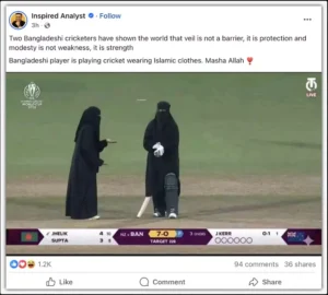 وائرل تصویر کے ساتھ مختلف کیپشنز میں لکھا گیا تھا، ’دو بنگلہ دیشی کھلاڑیوں نے دنیا کو دکھا دیا کہ پردہ رکاوٹ نہیں بلکہ حفاظت ہے، اور حیا کمزوری نہیں بلکہ طاقت ہے۔ بنگلہ دیشی کھلاڑی اسلامی ہدایات کے مطابق کھیل رہی ہیں، ماشاءاللہ۔‘