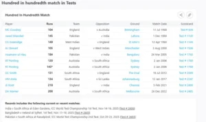 آسٹریلیا کے رکی پونٹنگ وہ واحد بیٹر ہیں جنہوں نے اپنے 100ویں ٹیسٹ میچ کی دونوں اننگز میں سنچریاں اسکور کی تھیں۔ انہوں نے جنوبی افریقہ کے خلاف 2 جنوری 2006 میں یہ اعزاز اپنے نام کیا تھا۔ رکی پونٹنگ نے پہلی اننگز میں 120 رنز کی اننگز کھیلی تھی جبکہ دوسری اننگز میں 143 رنز بنا کر ناٹ آؤٹ رہے تھے۔